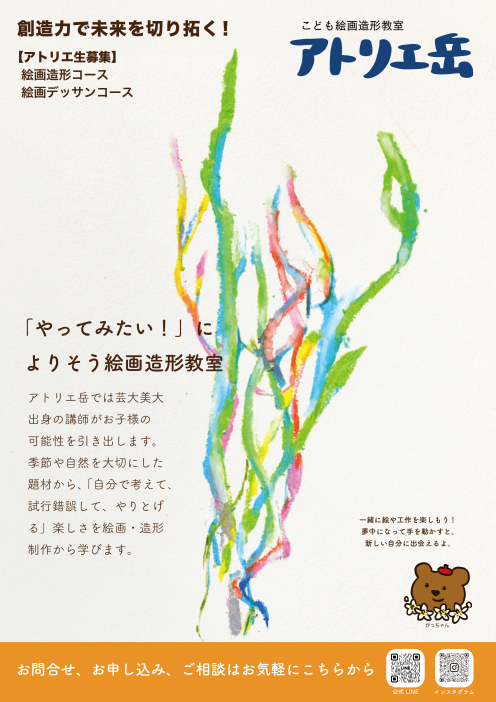 アトリエ岳は「創造力で未来を切り拓くける子どもを育てる」を目標に、以下の教育ビジョンを策定しました。 創造力を育む10のステップ https://atelier-gaku.tokyo/10step/ ①よく見る ②学ぶ ③考える ④手をうごかす ⑤試行錯誤 ⑥気づき ⑦感動 ⑧完成させる ⑨発展させる ...
